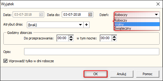 2. W oknie Wyjątek zmienić sekcję Dzień na Wolny/Świąteczny. Wybór zatwierdzić przyciskiem OK.