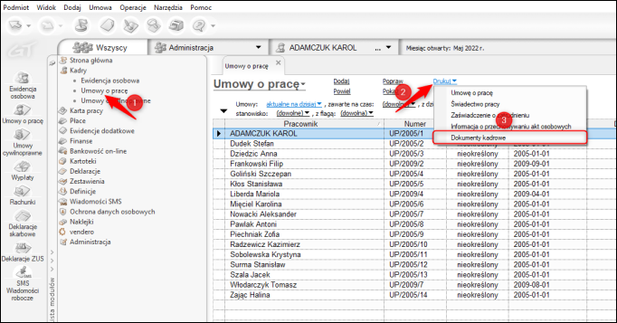 1. Z listy modułów należy wybrać Kadry – Umowy o pracę. Zaznaczyć umowę pracownika, dla którego ma zostać wydrukowane świadectwo pracy, a następnie z menu dostępnego nad listą wybrać Drukuj – Dokumenty kadrowe.