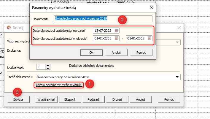 2. W okienku wydruku w polu Treść dokumentu należy wybrać Świadectwo pracy, kliknąć Parametry treści wydruku, określić właściwy okres, który świadectwo pracy ma obejmować i datę wydruku, a następnie kliknąć przycisk Edycja.