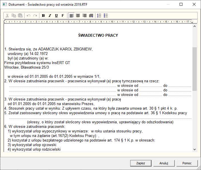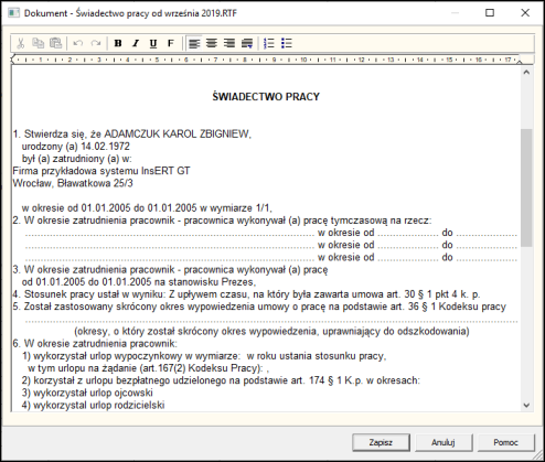 3. W oknie, które się pojawi, możemy dowolnie edytować treść dokumentu. Po naniesieniu zmian należy je zatwierdzić przyciskiem Zapisz (zmiany te nie są na stałe zapisywane w programie, jest to chwilowa korekta na potrzeby tylko jednego wydruku). Aby wydrukować poprawione świadectwo pracy, należy kliknąć przycisk Drukuj.