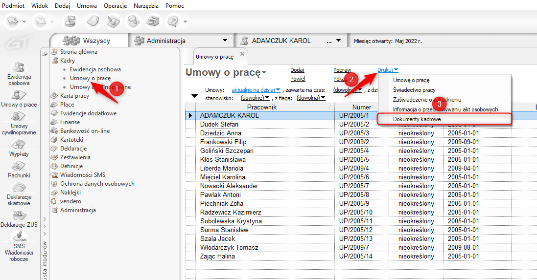 1. Z listy modułów należy wybrać Kadry – Umowy o pracę. Zaznaczyć umowę pracownika, dla którego ma zostać wydrukowane świadectwo pracy, a następnie z menu dostępnego nad listą wybrać Drukuj – Dokumenty kadrowe.