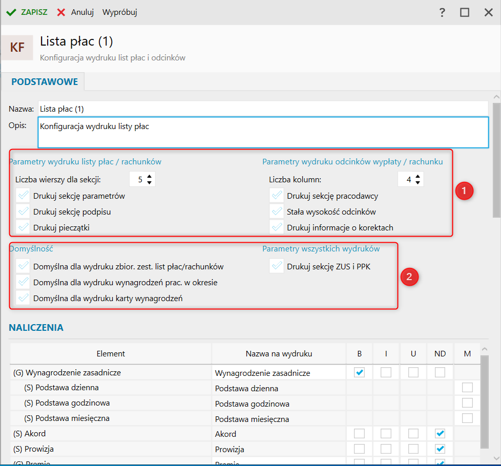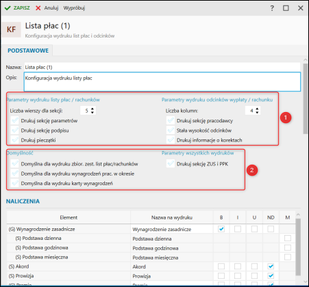 2. W pierwszej kolejności ustalić nazwę i opis, a także zdecydować, które z dostępnych parametrów wydruku listy płac oraz odcinków wypłaty/rachunku mają zostać użyte. Dla wydruku listy płac istnieje możliwość określenia: