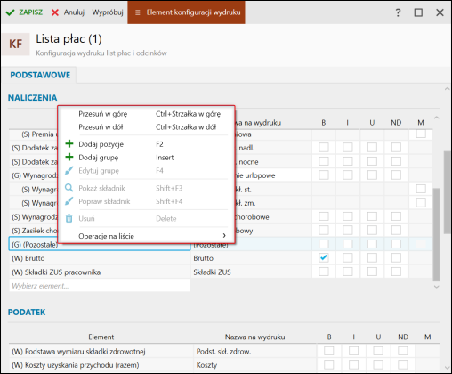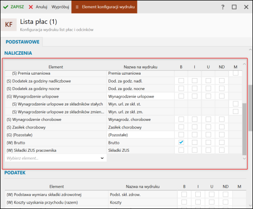 3. Sekcje Naliczenia, Podatek, Pracodawca, Netto oraz Parametry odpowiadają za konfigurację pól widocznych na wydruku. Istnieje możliwość wskazania własnego składnika poprzez kliknięcie Wybierz element i wskazanie go z rozwijalnej listy. Dla każdego elementu istnieje możliwość zdefiniowania dodatkowych parametrów: