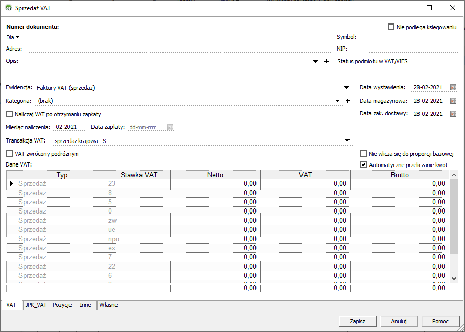 2. Pojawi się okno umożliwiające wprowadzenie zapisu do ewidencji VAT, a obowiązkowe pola do uzupełnienia są pogrubione.