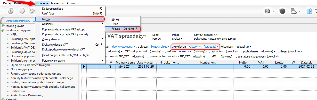 3. Po kliknięciu przycisku Zapisz program doda pozycję do wybranej ewidencji VAT. Aby ująć taki zapis w KPiR, należy wybrać z górnego menu Operacje lub z menu kontekstowego pod prawym przyciskiem myszy opcję Księguj – Pozycję. W przypadku księgowania większej ilości zapisów (opcje Księguj – Dzień oraz Księguj – Miesiąc) przed operacją należy wybrać wśród filtrów ewidencję, którą program ma zaksięgować.