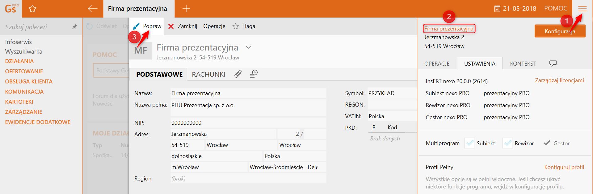 Okno Moja firma zawiera informacje wpisane przez użytkownika podczas tworzenia podmiotu, w tak zwanym ekranie wdrożeniowym. Są to m.in.: nazwa, NIP, forma prawna oraz podstawowy rachunek bankowy. Uzupełnienie pozostałych danych jest zalecane jako pierwszy krok, od którego należy rozpocząć pracę z systemem. Aby uzupełnić lub edytować te dane, należy w prawym, górnym rogu ekranu rozwinąć menu, kliknąć nazwę firmy i w oknie Moja firma nacisnąć Popraw.