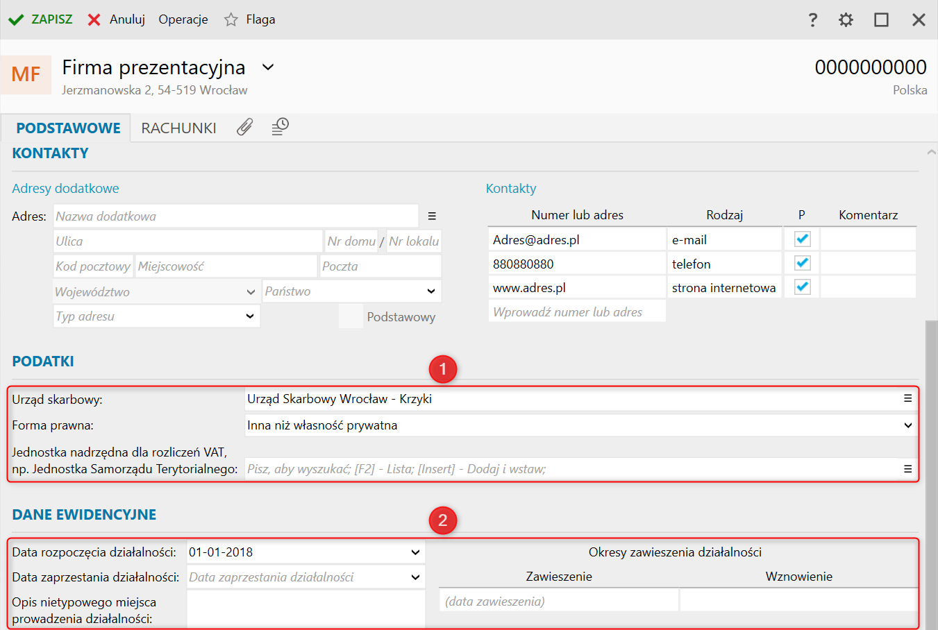 Warto również zwrócić uwagę na sekcje Podatki, w której określamy Urząd skarbowy, który w przypadku wyboru Formy prawnej - Inna niż wartość prywatna będzie przepisywał się do deklaracji oraz - w przypadku posiadania Jednostki nadrzędnej dla rozliczeń VAT - wybrania np. Jednostki Samorządu Terytorialnego. Ponadto, na zakładce Podstawowe można również uzupełnić Dane ewidencyjne, czyli Datę rozpoczęcia działalności, Opis nietypowego miejsca prowadzenia działalności etc.