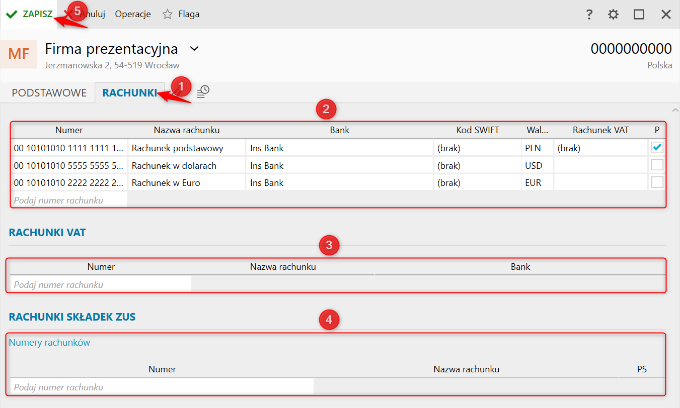 Drugą i ostatnią zakładką w oknie Moja firma jest Rachunki, w której można wprowadzić Rachunki bankowe podmiotu, rachunki na potrzeby Rozliczenia VAT i Składek ZUS. Aby zapisać wszystkie wprowadzone/edytowane informacje, należy kliknąć przycisk Zapisz.