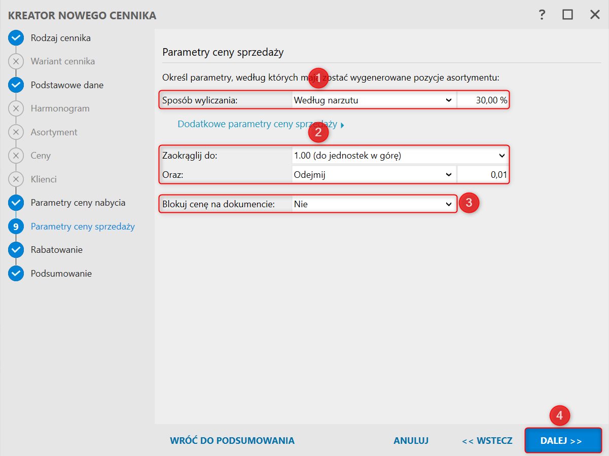 W oknie Kreator nowego cennika można w pełni sparametryzować nowo tworzony cennik. Parametryzacja cennika odbywa się w następujących krokach: