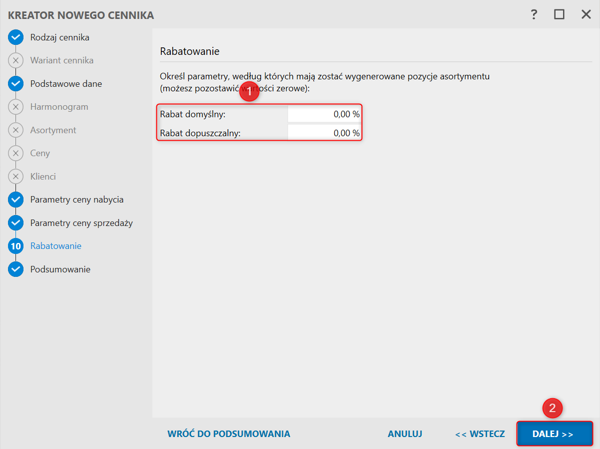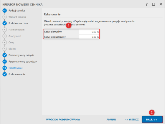 W tym kroku istnieje możliwość rezygnacji z dalszej parametryzacji cennika i zastosowanie domyślnych parametrów dla cenników (KonfiguracjaParametry cenników). W tym celu należy zaznaczyć znacznik Zastosuj domyślne parametry ceny nabycia, ceny sprzedaży oraz wartości rabatów i nacisnąć Dalej. Zastosowane parametry zostaną zaprezentowane w Podsumowaniu kreatora.