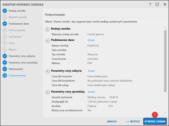 6. Podsumowanie – jest to ostatni krok Kreatora nowego cennika, który przedstawia wszystkie wcześniej wybrane opcje. Po sprawdzeniu, czy wszystko zostało ustawione poprawnie, należy kliknąć Utwórz cennik.