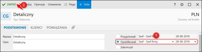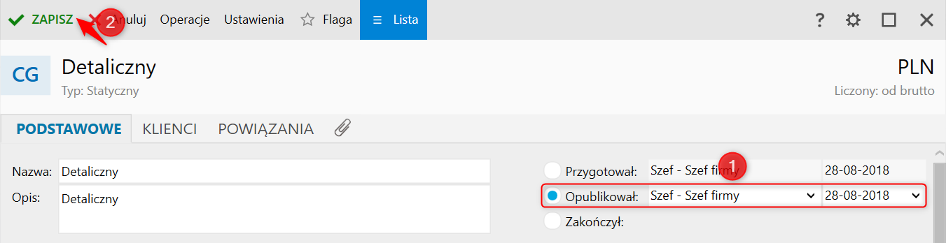 Tak stworzony cennik zostanie automatycznie otwarty i możliwy do Opublikowania. Opcja Opublikował – aktywuje cennik w systemie. Widoczność cennika można zweryfikować również w kartotece asortymentu. Funkcja Zakończył – spowoduje dezaktywacje poziomu cen bez jego usuwania. Podczas wystawiania dokumentu sprzedaży cennik podpowie się lub będzie możliwy do wybrania tylko wtedy, gdy zaznaczona będzie – opcja Opublikował.