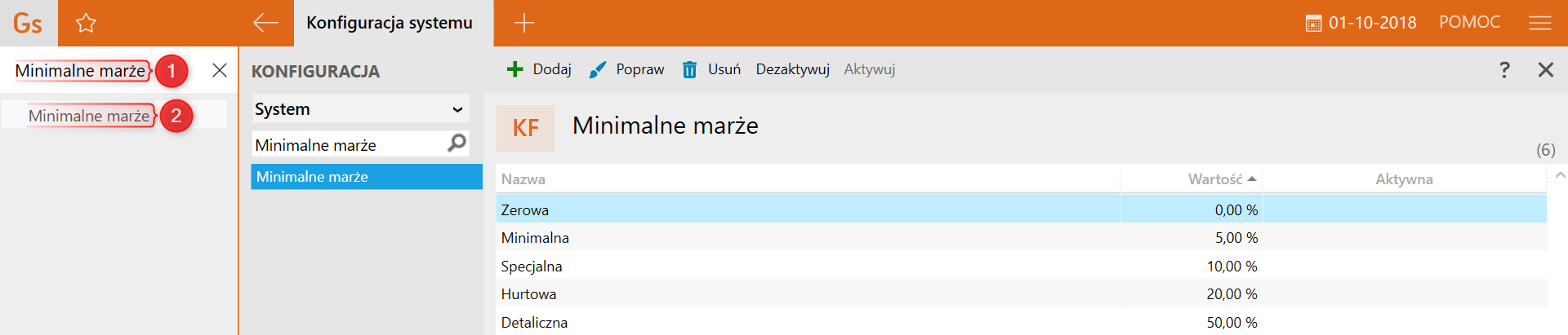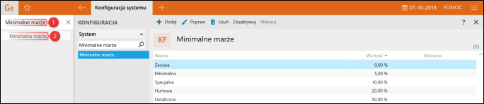 Warto również zwrócić uwagę na słownik Minimalne marże – umożliwia on kontrolę ustalania cen sprzedaży asortymentu. Podczas wystawiania faktury sprzedaży towar zostanie zaznaczony na czerwono, jeśli jego cena netto po rabacie w odniesieniu do ceny nabycia spadnie poniżej minimalnej marży. Minimalną marżę można zdefiniować w konfiguracji, wpisując w wyszukiwarce programu Minimalne marże.