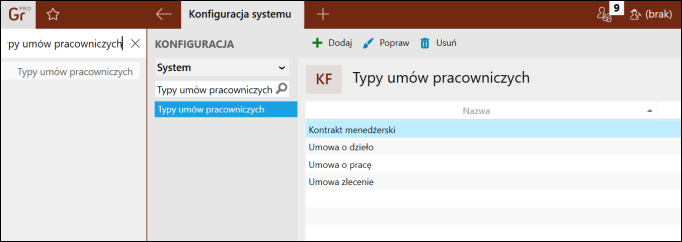 Dodatkowo, gdy użytkownik posiada wersje Gratyfikanta nexo PRO, może dodać własne typy umów pracowniczych, w których użytkownika ma możliwość spersonalizowania własnego zestawu danych umowy (np. wykonanie typu umowy cywilnoprawnej w wymiarze godzinowym).