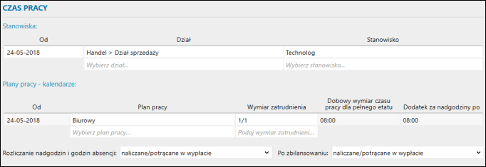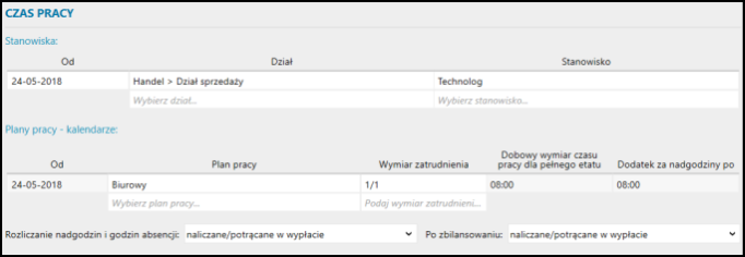 3. Sekcja Czas Pracy pozwala określić Dział, Stanowisko oraz okres od. Plany pracy – kalendarze pozwala na przypisanie dla pracownika kalendarza, na podstawie którego będzie rozliczany. Pełen opis konfiguracji planu pracy znajduję się w innym artykule e-Pomocy tutaj. Kolejną opcją dostępną w tej sekcji jest Sposób rozliczania nadgodzin i godzin absencji: