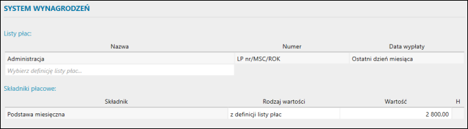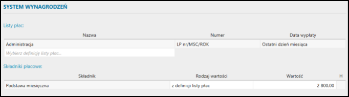 4. Sekcja System Wynagrodzeń pozwala na określenie Listy płac, w której umowa będzie rozliczana oraz Składniki płacowe (które przenoszą się z definicji listy płac).