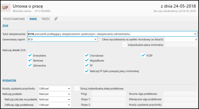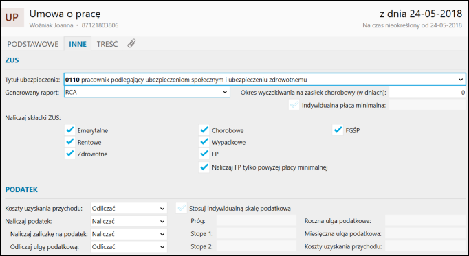 5. Na kolejnej zakładce Inne w sekcji ZUS i PPK widoczne są parametry dot. Tytułu ubezpieczenia, Generowania raportu, Okres wyczekiwania na zasiłek chorobowy, znaczniki dotyczące, jakie składki ZUS program naliczać. Zaznaczenie znacznika Indywidualna płaca minimalna pozwala na określenie własnej wartości, do której program będzie się stosował. W sekcji Podatek znajdują się typowe dla umów o pracę ustawienia związane z podatkami. Można określić odliczanie, naliczanie lub nieodliczanie. Dodatkowo ustawić indywidualną stawkę progu podatkowego.