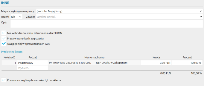 6. Sekcja Inne pozwala na określenie Miejsca wykonywania pracy, czy pracownik jest uczniem, Zawód oraz własny opis. Zaznaczenie poniższych ustawień spowoduje, że: