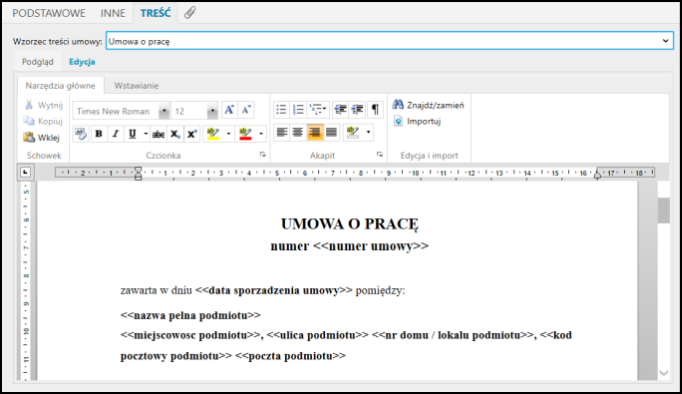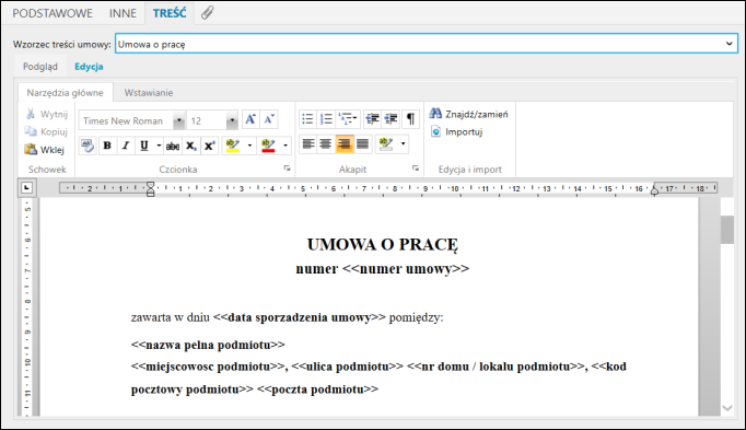7. W zakładce Treść możliwy do wybrania jest Wzorzec treści umowy, na podstawie którego przy wydruku umowy o pracę program zastosuję się do tak sformatowanego tekstu. Edycja oraz dodawanie własnych wzorców dostępna jest z Konfiguracja – Treści dokumentów.