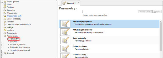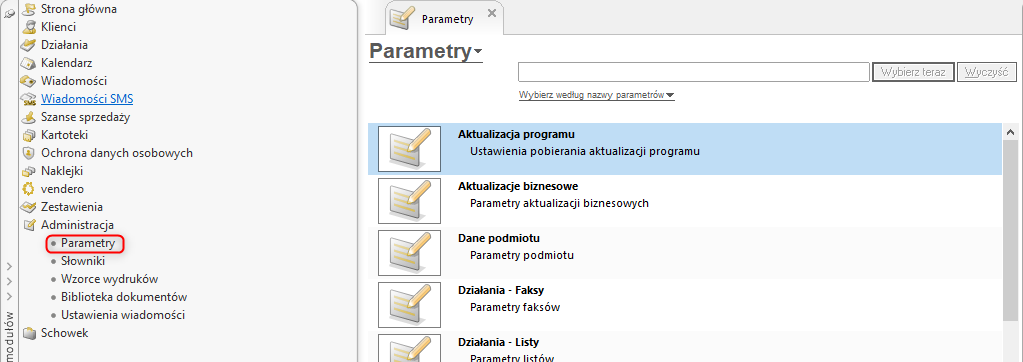 Ustawienia dotyczące większości modułów programu są dostępne w jednym zbiorczym module Administracja – Parametry. Przed rozpoczęciem pracy z programem warto sprawdzić, czy każdy z parametrów odpowiada specyfice pracy.