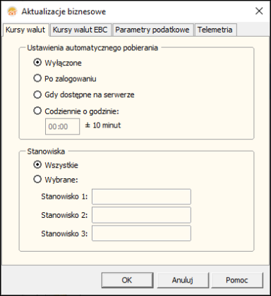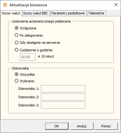 Parametr odpowiada za pobieranie kursów walut i parametrów dodatkowych. Domyślnie pobieranie jest wyłączone, użytkownik może to przełączyć na jedną z dostępnych opcji.