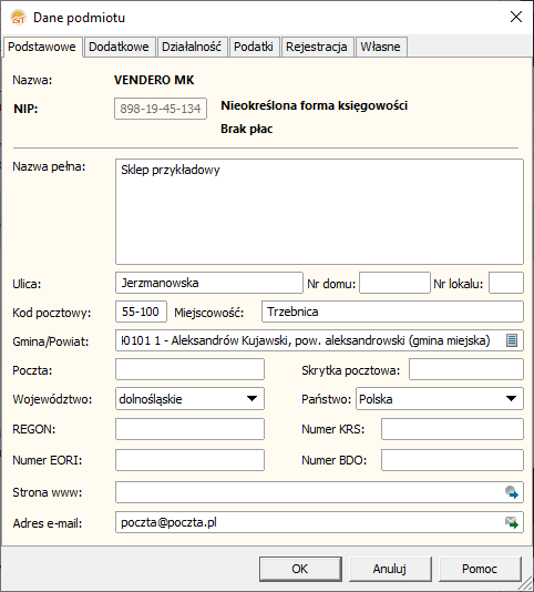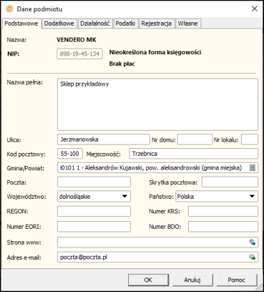 Jeden z ważniejszych parametrów w programie. Na zakładce Podstawowe, Dodatkowe i Rejestracja należy uzupełnić informacje o firmie. Zakładka Działalność służy do wyboru urzędu skarbowego, formy prawnej, wskazania osoby fizycznej do deklaracji i wyboru typu/rodzaju prowadzonej działalności (w przypadku połączenia z programem księgowym). Na zakładce Podatki znajdują się ustawienia dotyczące podatku VAT oraz VAT UE (w przypadku połączenia z programem księgowym).
