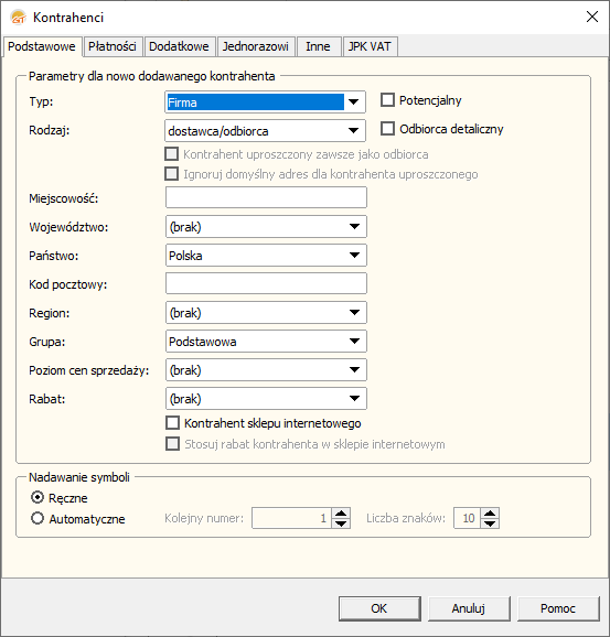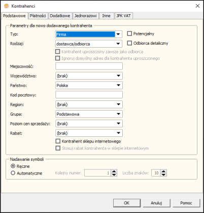 Informacje wprowadzane do zakładek okna dialogowego Kontrahenci będą wykorzystywane podczas wprowadzania nowych firm do kartoteki kontrahentów. Większość z dostępnych parametrów można zmieniać w dowolnym momencie pracy z programem. Warto zwrócić uwagę, że w rubrykach tych najlepiej jest umieszczać parametry dotyczące tych kontrahentów, z którymi firma utrzymuje najczęstsze kontakty.