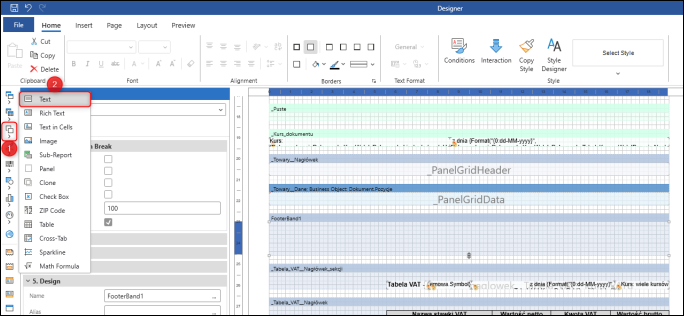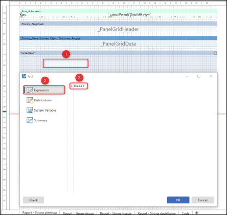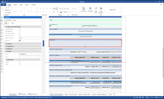 4. W oknie programu Stimulsoft należy przejść na zakładkę Raport – pierwsza strona, a następnie w lewym menu wybrać Bands – Footer.