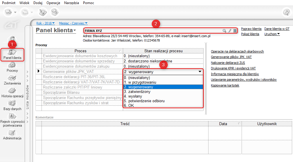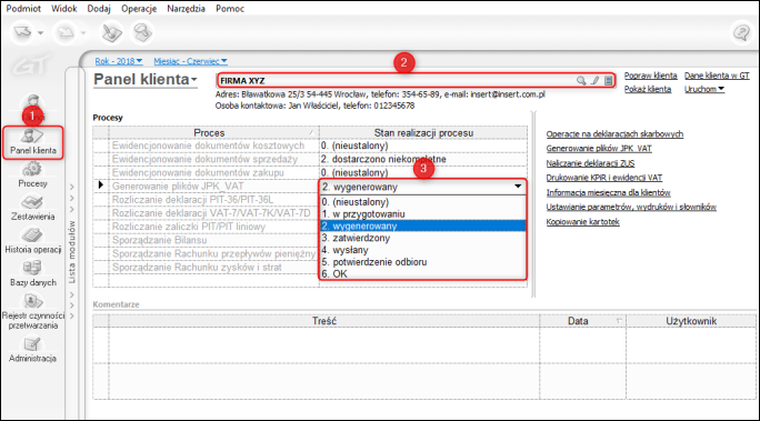 Pod polem do wyboru klienta, pojawią się podstawowe informacje kontaktowe, a tabela poniżej wypełni się procesami przypisanymi do tego klienta (więcej o procesach można przeczytać w temacie e-pomocy – tutaj). Z tego poziomu można zmienić etap procesu, rozwijając listę etapów w kolumnie Stan realizacji procesu przy konkretnym procesie.