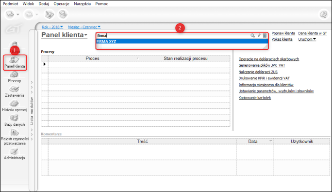 Moduł Panel klienta prezentuje informacje związane z klientem biura rachunkowego, umożliwia zmianę statusu wykonywanych dla niego usług (procesów) oraz wykonywać operacje zbiorcze dla wielu klientów. Aby rozpocząć pracę z tym modułem, należy z paska skrótów wybrać Panel klienta i w polu znajdującym się w górnej części modułu wyszukać klienta, którego informacje potrzeba wyświetlić.