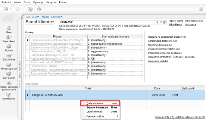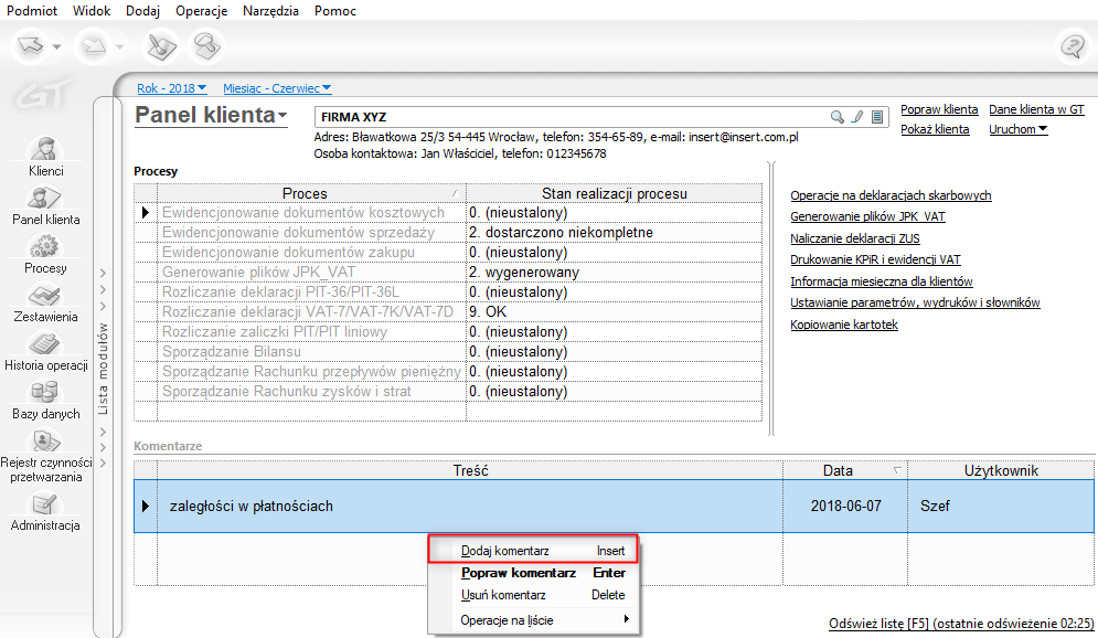 Sekcja komentarze umiejscowiona na dole modułu pozwala dodać do klienta przydatne dla pracowników biura notatki. Aby dodać taki komentarz, należy kliknąć tę sekcję Prawym Przyciskiem Myszy i wybrać opcję Dodaj komentarz. Oprócz treści zostanie również wyświetlona Data wprowadzenia oraz nazwa Użytkownika, który dodawał wpis.