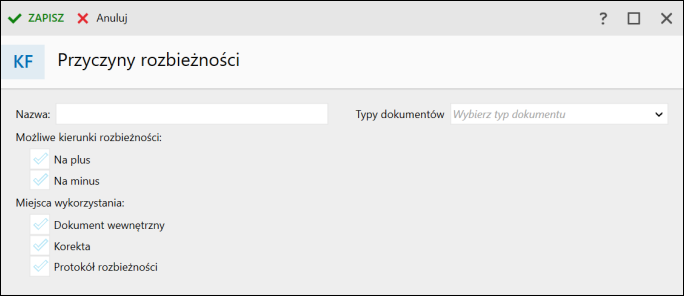 2. Wskazać Nazwę, Typy dokumentów, na których przyczyna ma być wykorzystana, Kierunki rozbieżnościna plus, gdy towaru jest więcej, niż zapisano na pozycji dokumentu, na minus w przypadku, gdy ilość jest mniejsza. Zdecydować, w jaki sposób ma być traktowana nieprawidłowość – wewnętrznie, czyli za pomocą dokumentu wewnętrznego PW/RW, wystawiając korektę lub zwrot do PZ, czy zostawić jedynie do celów ewidencyjnych – protokół rozbieżności
