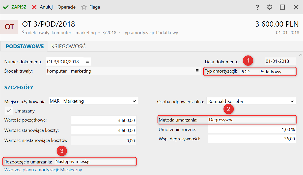 Dzięki temu Metoda umarzania Miesiąc rozpoczęcia umarzania i Typ amortyzacji będą możliwe do edycji. Należy pamiętać, że po edycji i zapisie dokumentu OT należy z powrotem zatwierdzić Plan amortyzacji. Bez zatwierdzenia Planu amortyzacji nie będzie możliwości odliczania rat amortyzacyjnych.