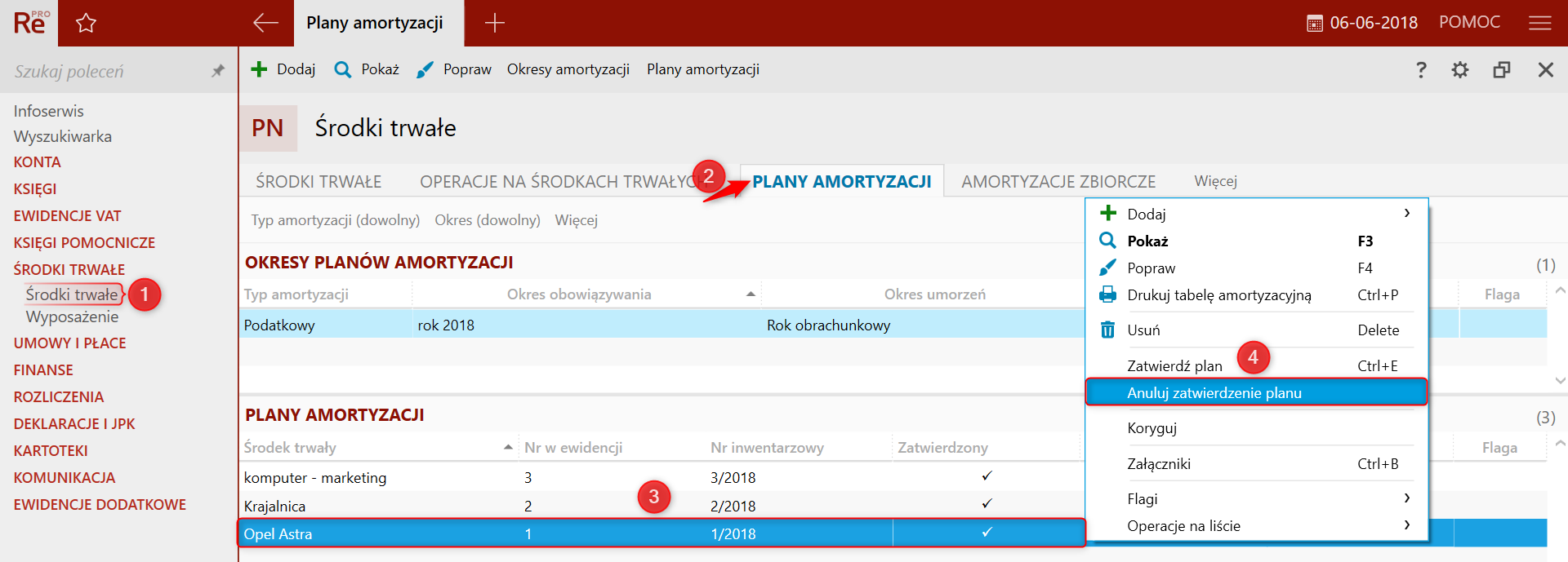 W takim przypadku odblokowanie dokumentu OT jest możliwe tylko poprzez wycofanie zatwierdzenia Planu amortyzacji. Aby to zrobić, należy: