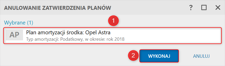 2. Upewnić się, czy został wybrany poprawny Plan amortyzacji i zatwierdzić przyciskiem Wykonaj.