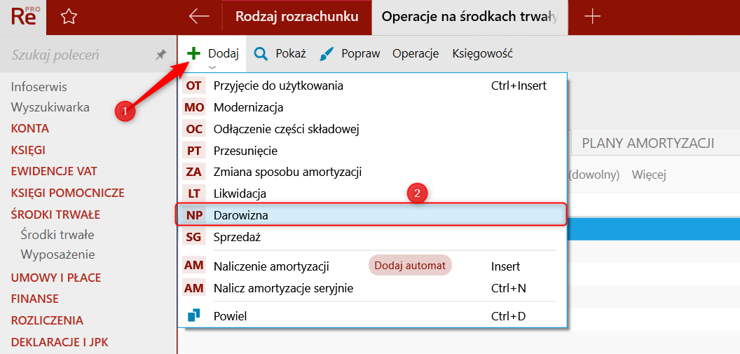 2. Przejść do modułu Środki trwałe, na zakładkę Operacje na środkach trwałych.