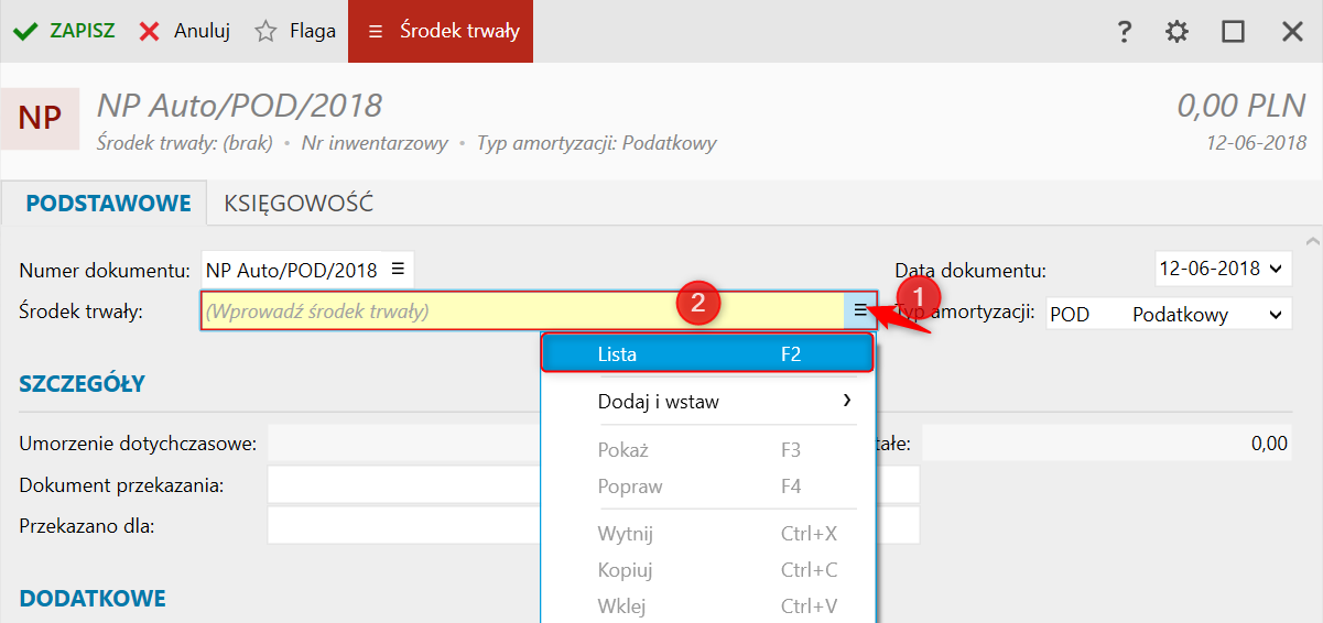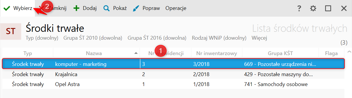 4. Z rozwijalnego menu przy polu Środek trwały wybrać Lista, po czym z listy wskazać Środek trwały.