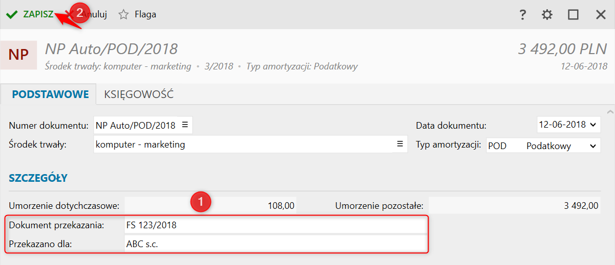 5. Uzupełnić pola Dokument przekazania i Przekazano dla, po czym zatwierdzić przyciskiem Zapisz.