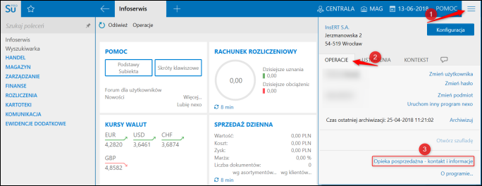 1. Wybrać w programie „drabinkę” ≡ znajdującą się w prawym górnym rogu, następnie na zakładce Operacje wybrać Opieka posprzedażna – kontakt i informacje.