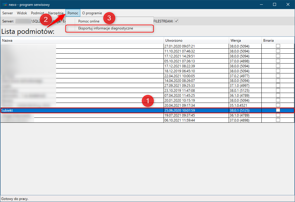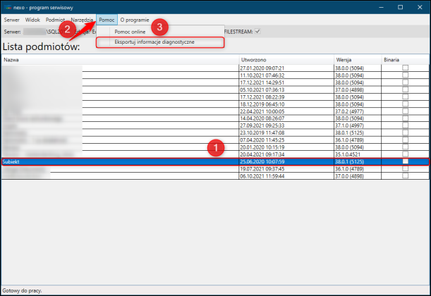 1. Przejść do programu serwisowego, zaznaczyć odpowiedni podmiot i wybrać z górnego menu Pomoc – Eksportuj informacje diagnostyczne.