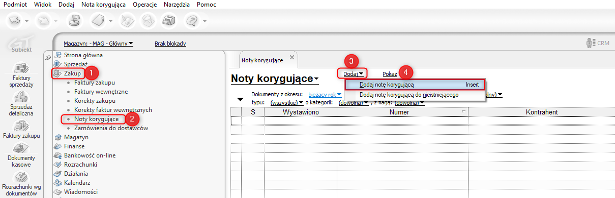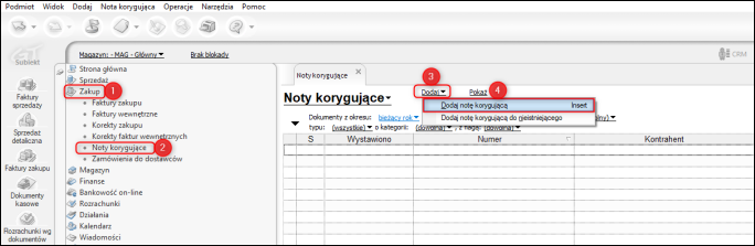1. Z listy modułów wybrać Zakup – Noty korygujące, rozwinąć opcję Dodaj i wybrać Dodaj notę korygującą.