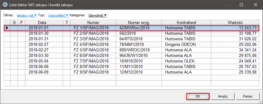 2. W wyświetlonym oknie zaznaczyć fakturę zakupu, która ma zostać skorygowana i wybór zatwierdzić przyciskiem OK.