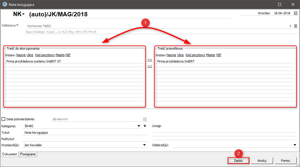 3. Wypełnić Treść do skorygowania oraz Treść prawidłową. Dokument wprowadzić wciskając przycisk Zapisz.