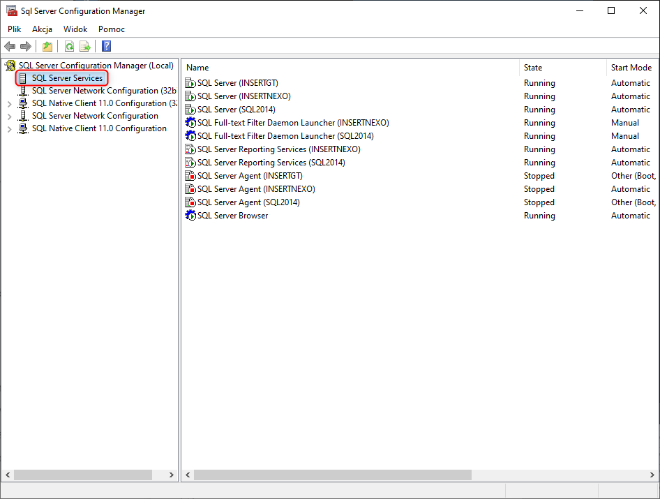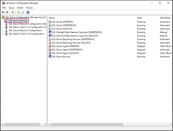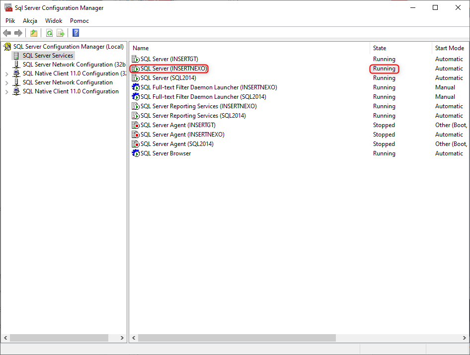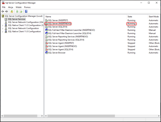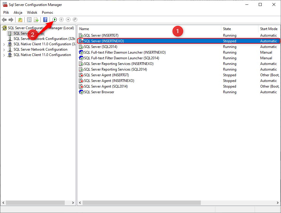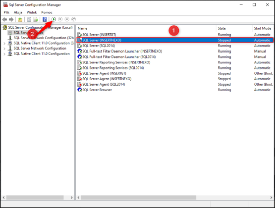 6. Wrócić do SQL Server 2014 Configuration Manager-SQL Server Services. Kliknąć pozycję SQL Server (INSERTNEXO) i wybrać ikonę Start.
