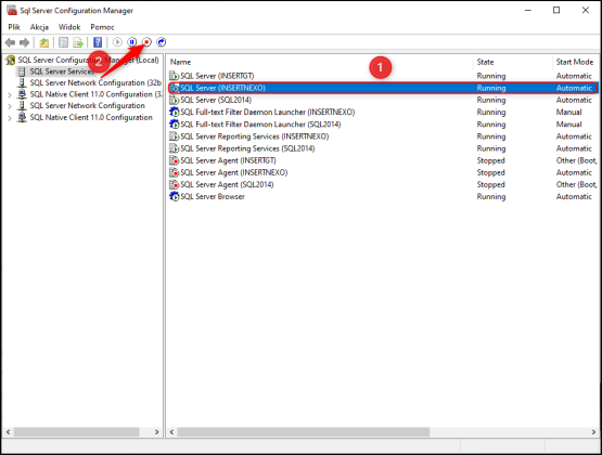 4. Kliknąć pozycję SQL Server (INSERTNEXO) i wybrać ikonę Stop.