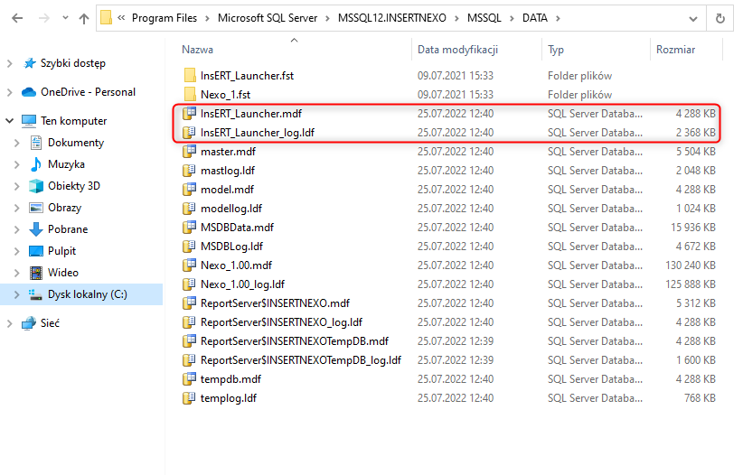 5. Przejść do katalogu wskazanego w komunikacie o błędzie, zwykle jest to C:\Program Files\Microsoft SQL Server\MSSQL11.INSERTNEXO\MSSQL\DATA\. Usunąć z ww. katalogu pliki o nazwach: InsERT_Launcher.mdf oraz InsERT_Launcher_log.ldf.