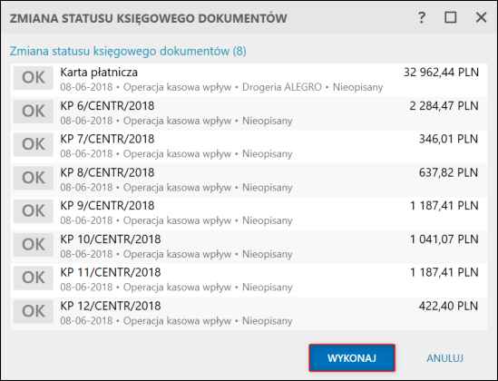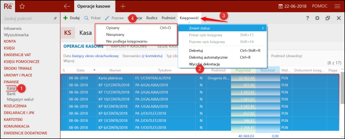 1. Przejść do modułu Kasa, wskazać dokumenty, następnie kliknąć górne menu Księgowość – Zmień status i wybrać status.