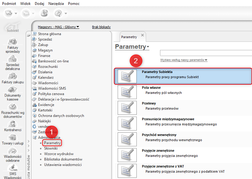 1. Przejść do modułu Administracja – Parametry – Parametry Subiekta.