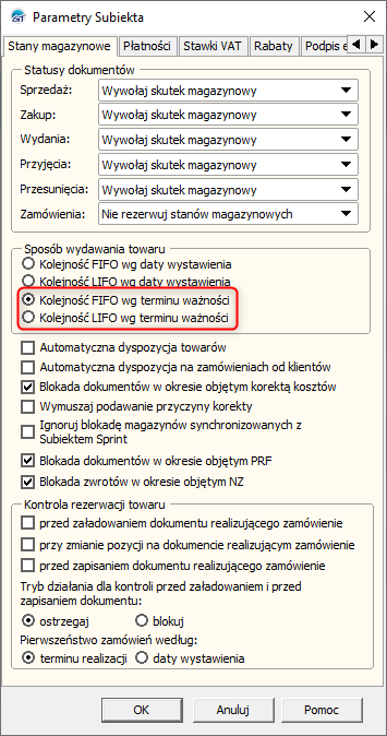 2. Zmienić sposób wydawania towaru na Kolejność FIFO wg terminu ważności lub Kolejność LIFO wg terminu ważności.