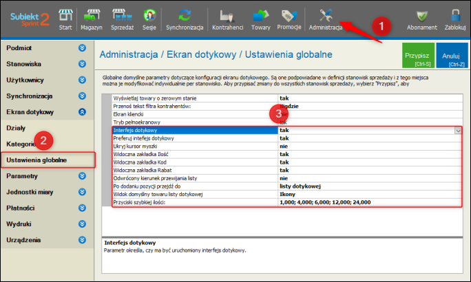 1. W programie Subiekt Sprint Zarzadzanie przejść do modułu Administracja, następnie z bocznego menu wybrać Ekran dotykowy - Ustawienia globalne. Parametr Interfejs dotykowy ustawić na Tak, po czym określić między innymi widoczność kursora myszki, zakładek: ilość, kod, rabat. Dodatkowo system umożliwia wykorzystywanie gestów przyspieszających pracę: